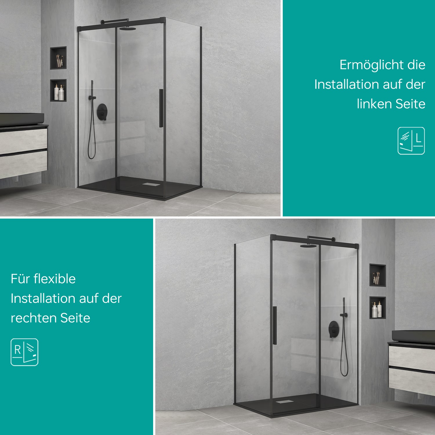 glasvilla Duschkabine Schiebetür 6mm ESG-Sicherheitsglas Duschabtrennung Soft-Close-Mechanismus Seitenanstieg Ravenna12K Schwarz