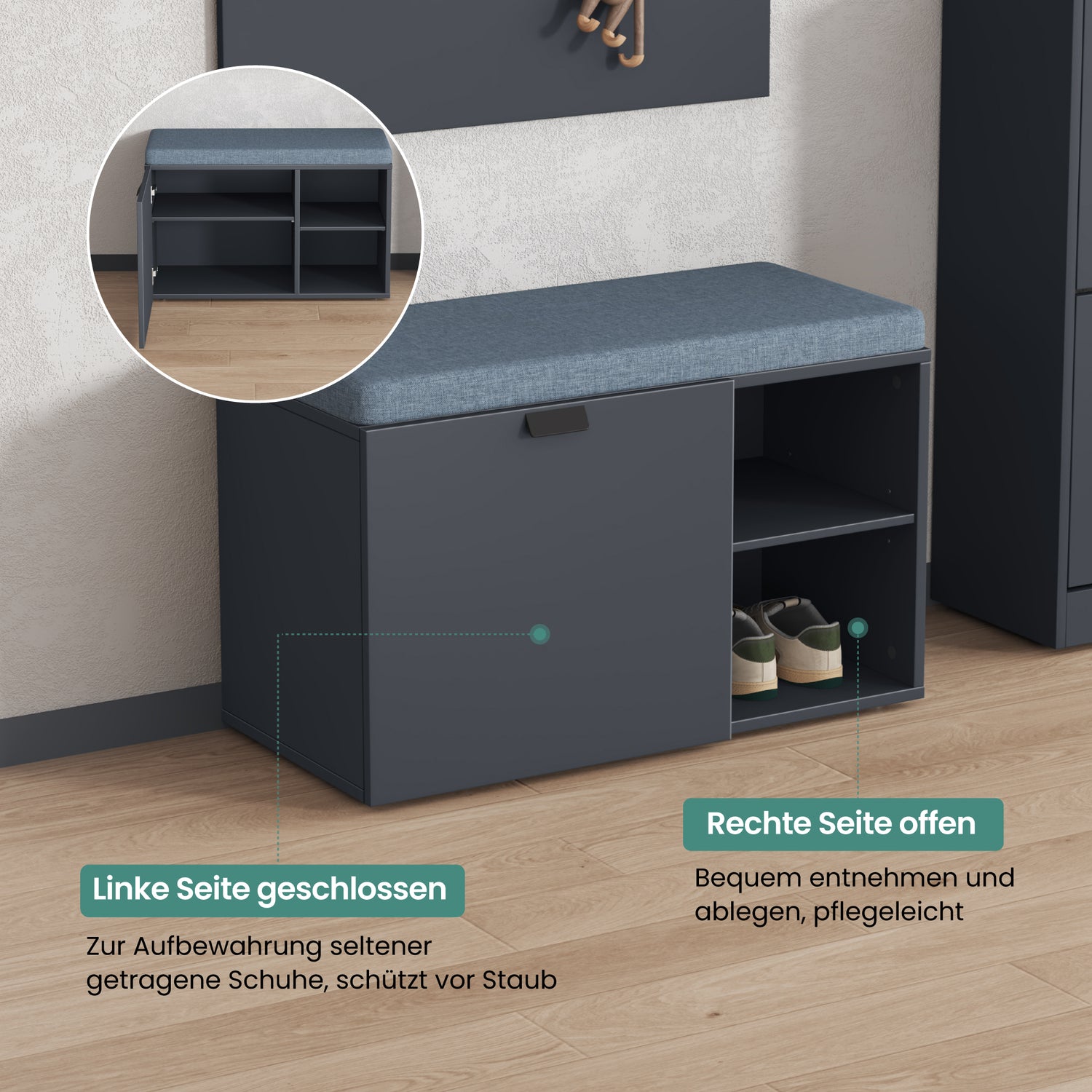 - Doppelter Stauraum: Geschlossene linke Seite zur staubgeschützten Aufbewahrung selten getragener Schuhe, offene rechte Seite für bequemes Entnehmen und Ablegen im Alltag.
