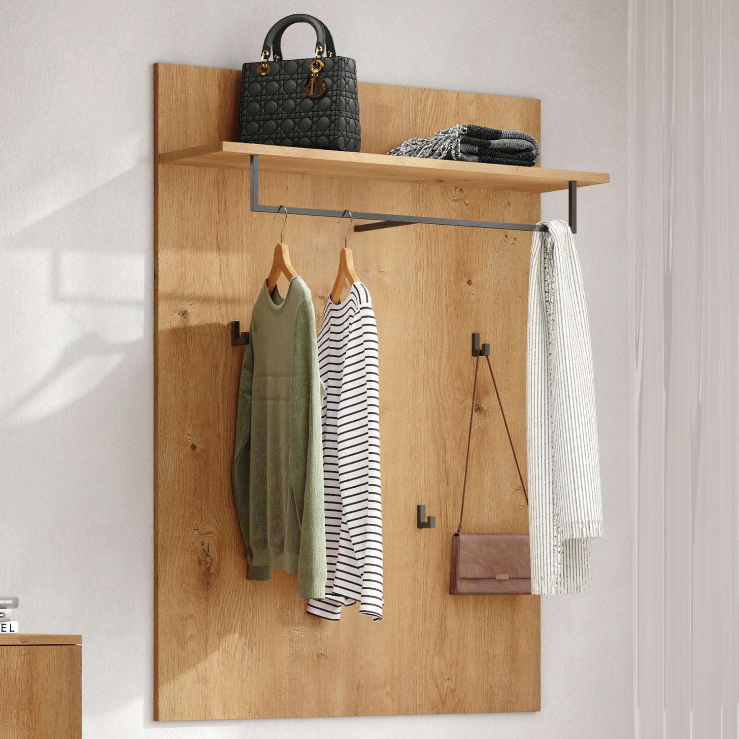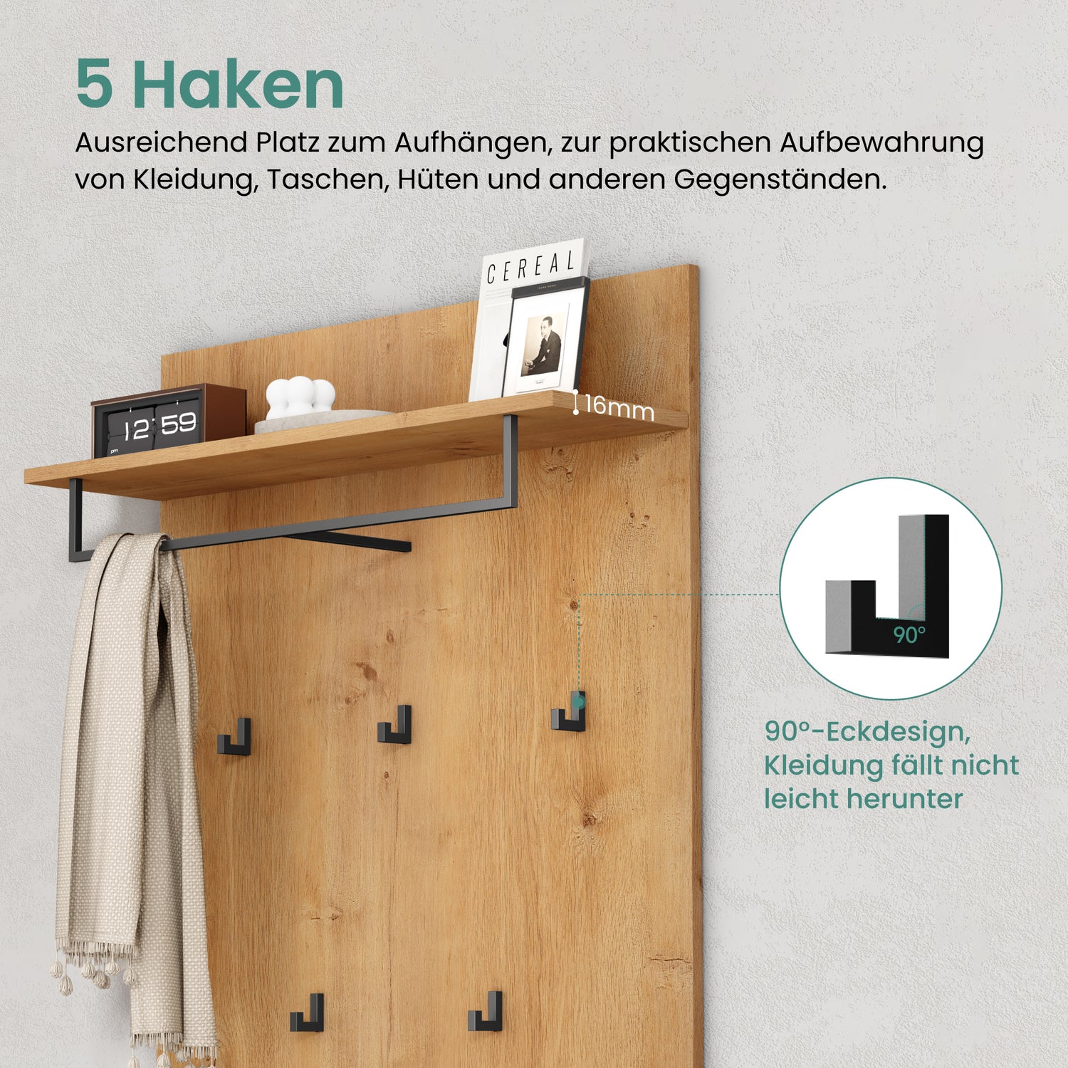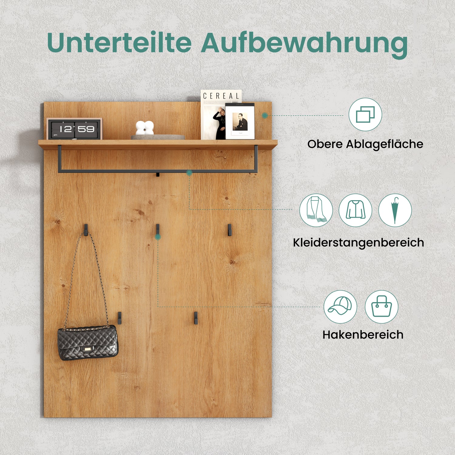 • Multifunktionales Garderobenpaneel: Mit oberer Ablagefläche, Kleiderstange und praktischem Hakenbereich mit 5 Haken – ideal für Jacken, Taschen und Accessoires.