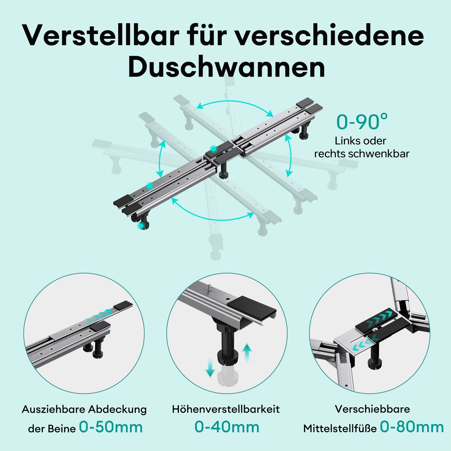 - Verstellbar für verschiedene Duschwannen: 0–90° links oder rechts Schwenkare Füße, ausziehbare Beine 0–50 mm, Höhenverstellbar 0–40 mm, verschiebbare Mittelstellfüße 0–80 mm.