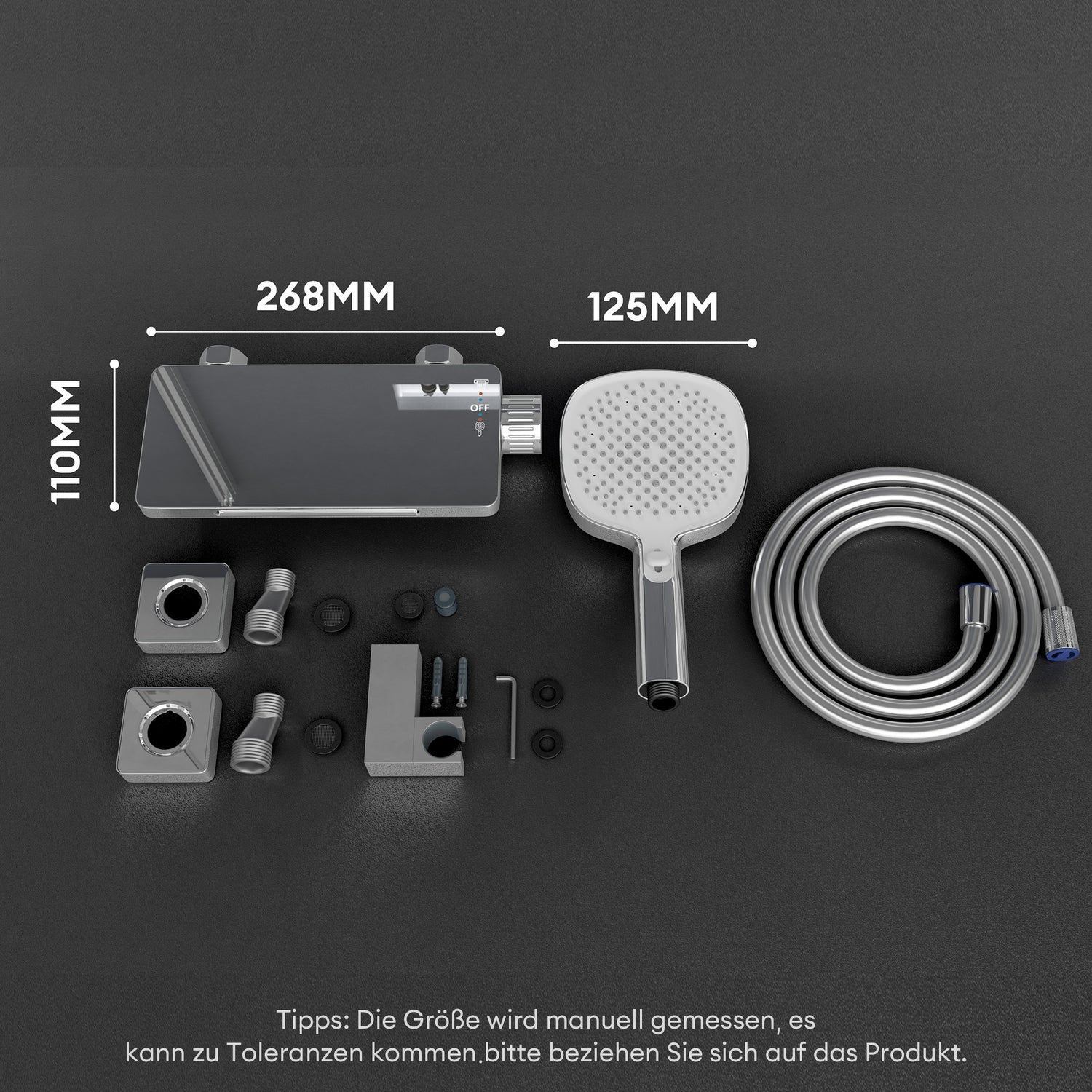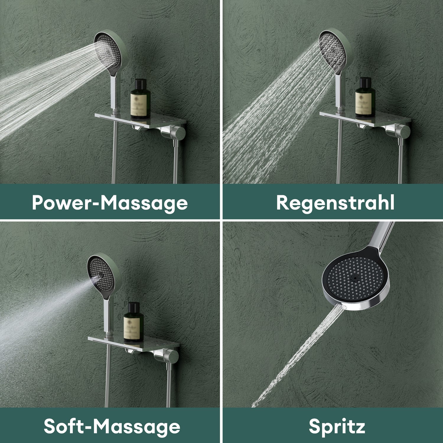- Strahlarten: Power-Massage, Regenstrahl, Soft-Massage und Spritz. Der kraftvolle Hochdruck-Duschkopf ermöglicht eine mühelose Reinigung bis in jede Ecke