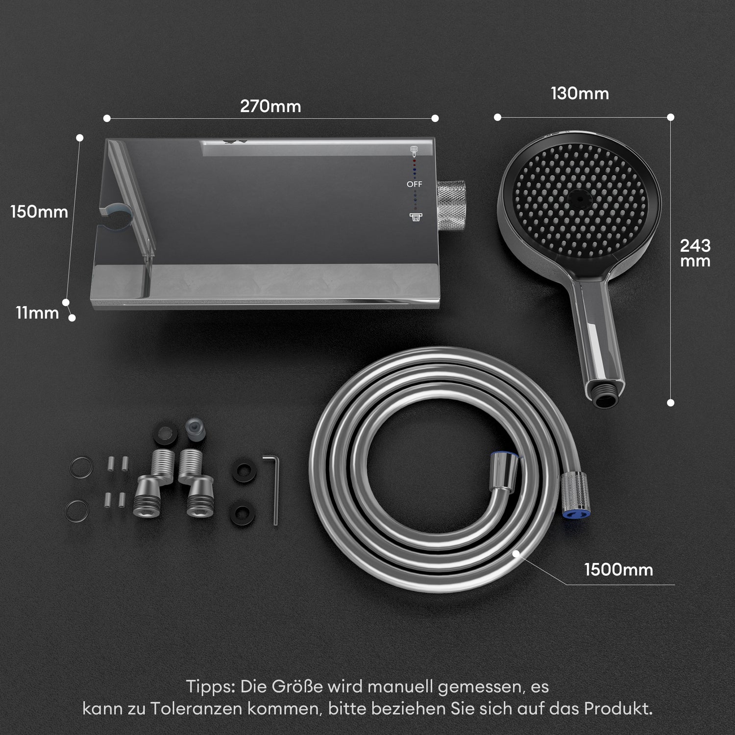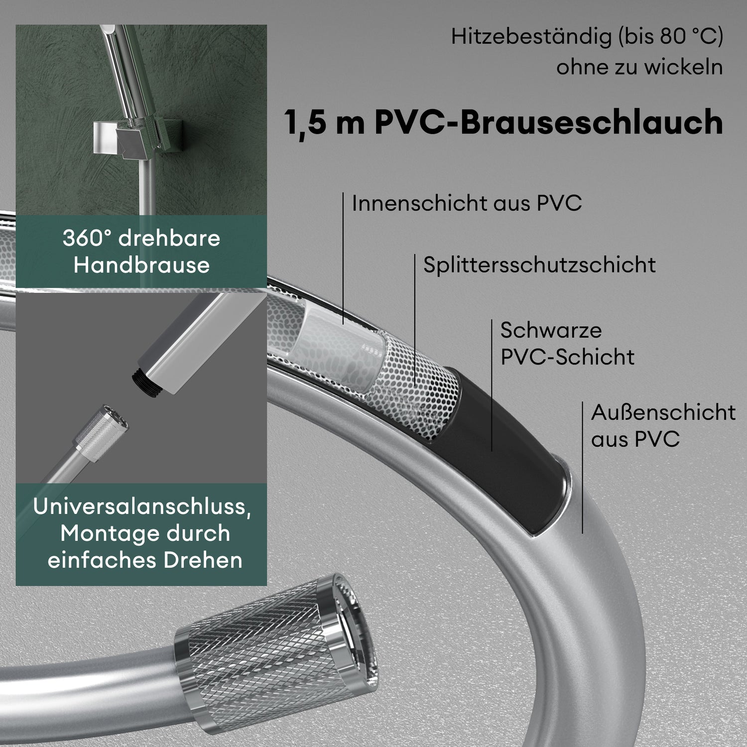 - Verdrehsichere Duschschlauch: 1,5 m PVC-Schlauch mit verdrehsicherem Design, hitzebeständig bis 80 °C, nach DIN-Norm montierbar